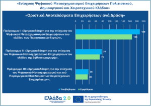 Το Υπουργείο Πολιτισμού, σε συνεργασία με τα Υπουργεία Εθνικής Οικονομίας και Οικονομικών, και Ψηφιακής Διακυβέρνησης, ενημερώνει για την έκδοση των οριστικών αποτελεσμάτων του Προγράμματος «Ενίσχυση Ψηφιακού Μετασχηματισμού Επιχειρήσεων Πολιτιστικού, Δημιουργικού και Χειροτεχνικού Κλάδου». Το Πρόγραμμα υλοποιείται από την Κοινωνία της Πληροφορίας στο πλαίσιο του «Εθνικού Σχεδίου Ανάκαμψης και Ανθεκτικότητας «Ελλάδα 2.0» με χρηματοδότηση της Ευρωπαϊκής Ένωσης – NextGenerationEU”.