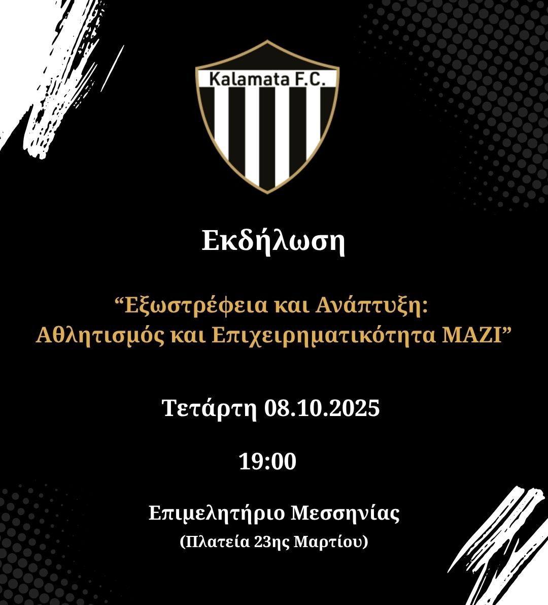 Η ΠΑΕ Καλαμάτα, αναγνωρίζοντας τον σημαντικό ρόλο που διαδραματίζει η τοπική επιχειρηματική κοινότητα στην ανάπτυξη και την προβολή του τόπου μας, σας προσκαλεί σε ανοιχτή εκδήλωση με θέμα: