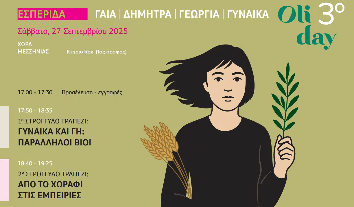 Το Σάββατο 27 Σεπτεμβρίου 2025, στις 17:00, η Χώρα Μεσσηνίας φιλοξενεί την εσπερίδα «Γαία, Δήμητρα, Γεωργία, Γυναίκα» που διοργανώνει ο ΑΕΣ-ΟΠ Νηλέας, στα πλαίσια του διήμερου «3ο Oliday: Διαδραστικό Συμπόσιο».