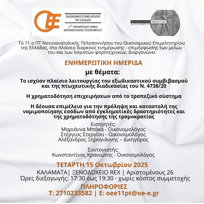 ΟΙΚΟΝΟΜΙΚΟ ΕΠΙΜΕΛΗΤΗΡΙΟ ΤΗΣ ΕΛΛΑΔΑΣ 11ο ΠΕΡΙΦΕΡΕΙΑΚΟ ΤΜΗΜΑ ΝΟΤΙΟΑΝΑΤΟΛΙΚΗΣ ΠΕΛΟΠΟΝΝΗΣΟΥ Το 11ο ΠΤ Νοτιοανατολικής Πελοποννήσου του Οικονομικού Επιμελητηρίου της Ελλάδας, στο πλαίσιο διαρκούς ενημέρωσης – επιμόρφωσης των μελών του και των λογιστών φοροτεχνικών, διοργανώνει στην Καλαμάτα, ενημερωτική ημερίδα με θέματα: Το ισχύον πλαίσιο λειτουργίας του εξωδικαστικού συμβιβασμού και της πτωχευτικής διαδικασίας του Ν. 4738/202 Η χρηματοδότηση […]